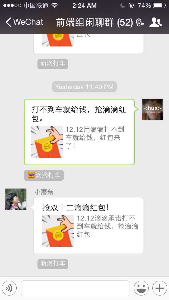 于是,每天 9 ~ 12 点间,公司里的叫车声、电话约车声、络绎不绝。我们团队私下里也有个微信群,用以和工作的旺旺群区分。在打车软件玩起红包返现后,大家就都会在群里分享叫车红包,52个人的群,有时一分钟内不抢,红包就没了。